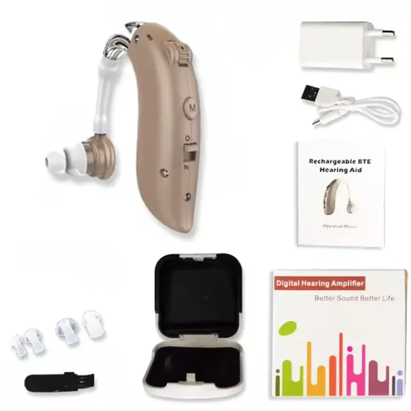 Mejora la calidad de vida con nuestro audífono recargable BTE (detrás de la oreja), diseñado específicamente para ancianos que necesitan un apoyo adicional en su audición. Este amplificador de sonido portátil es fácil de llevar y permite a los usuarios aumentar significativamente la cantidad de sonido que pueden escuchar, mejorando la claridad y la comprensión en conversaciones y entornos cotidianos.