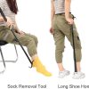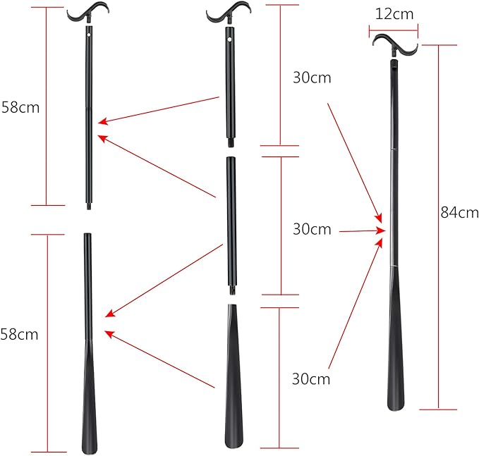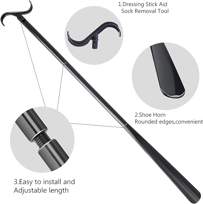 El bastón calzador es una herramienta versátil que facilita vestirse, permitiendo ponerse y quitarse zapatos, calcetines, camisas, pantalones y faldas sin agacharse. Minimiza la torsión y el estiramiento.